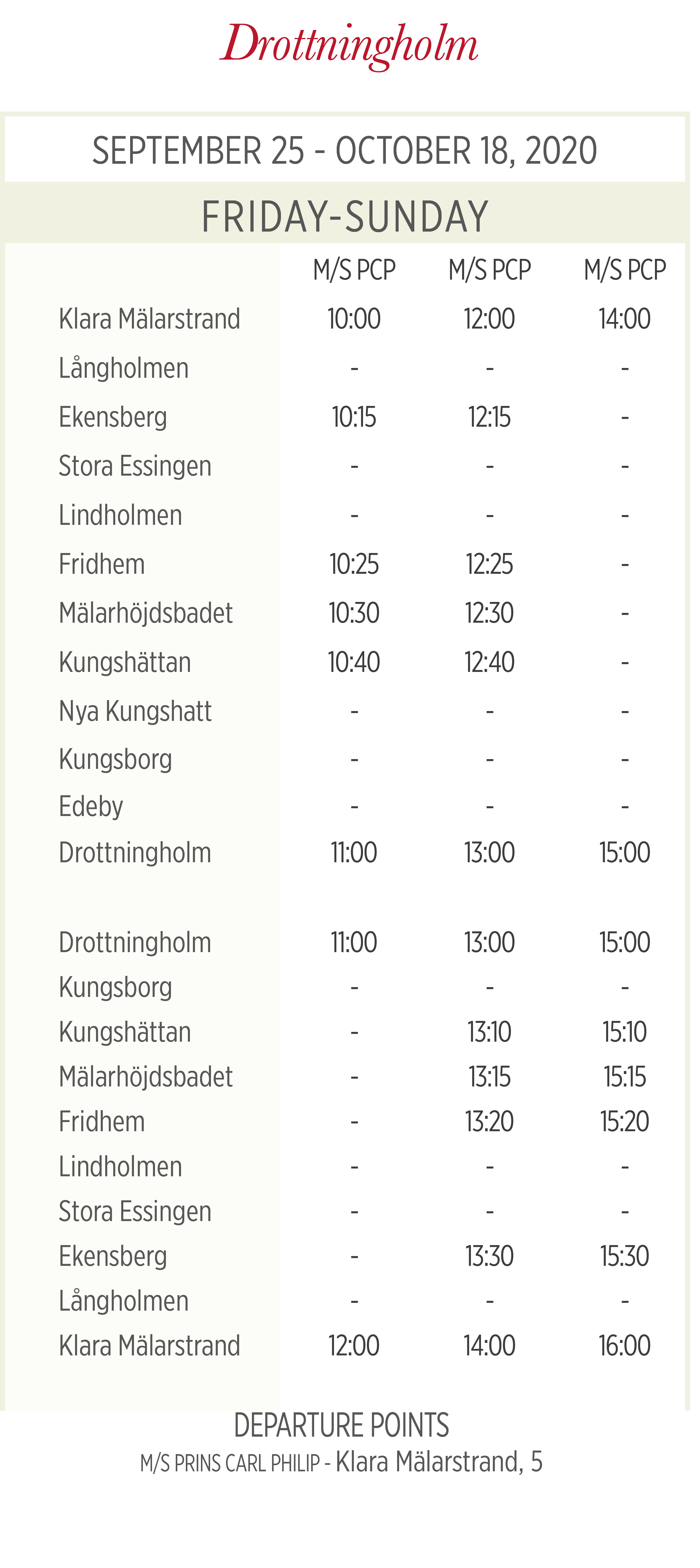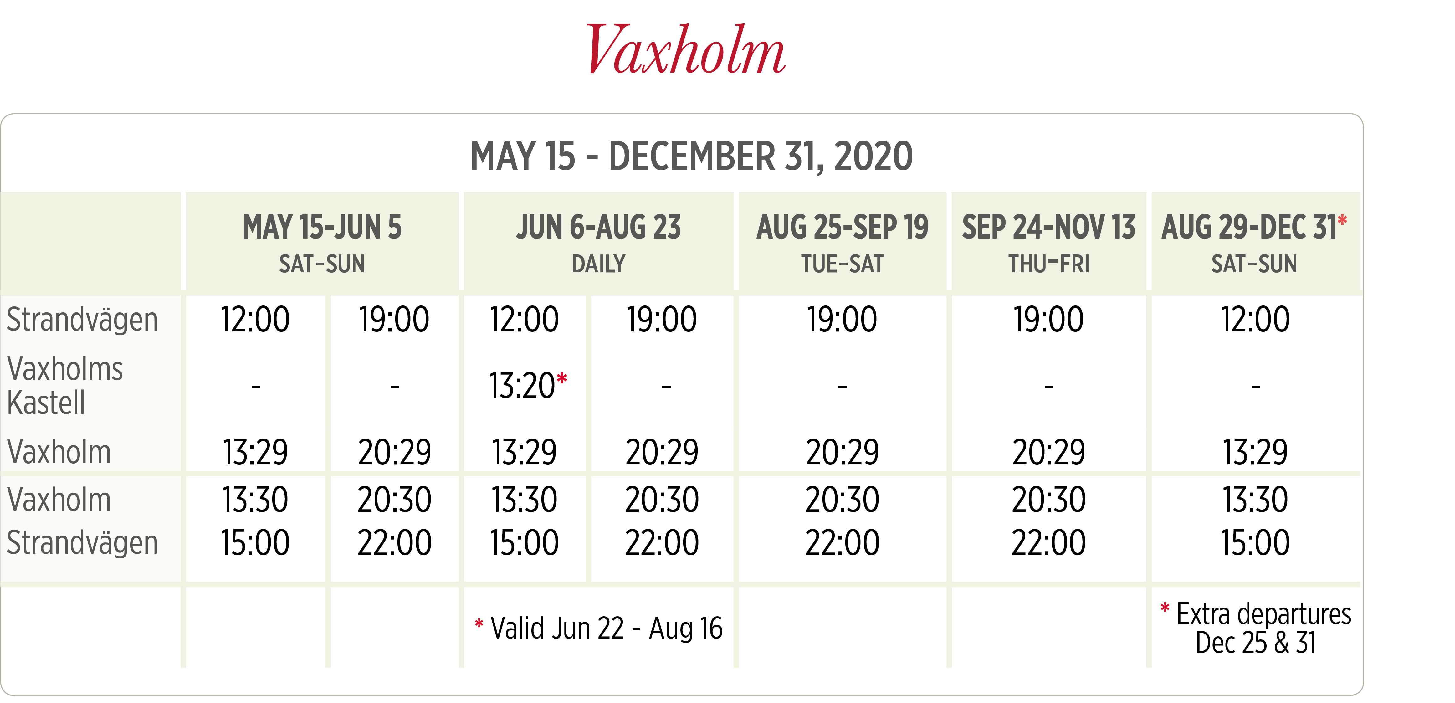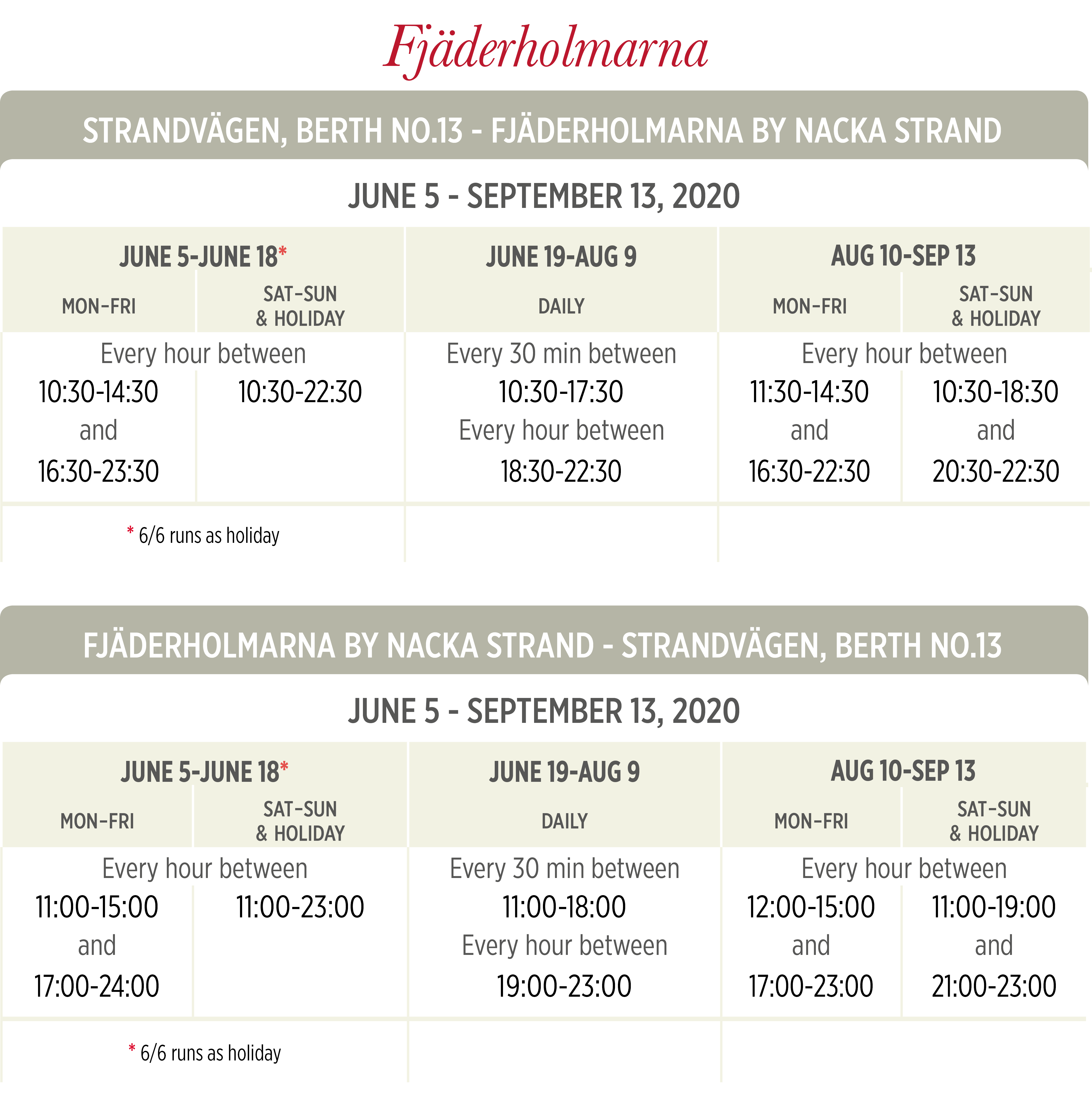 | Согласно текущему расписанию (срок действия 15.12.2019–18.06.2020), поездка в одном направлении по маршруту Ropsten – Gåshaga brygga (и наоборот) обычно занимает 22–23 минуты (для ряда первых утренних [только по выходным и праздничным дням] и последних вечерних рейсов – 21 минуту). | ||