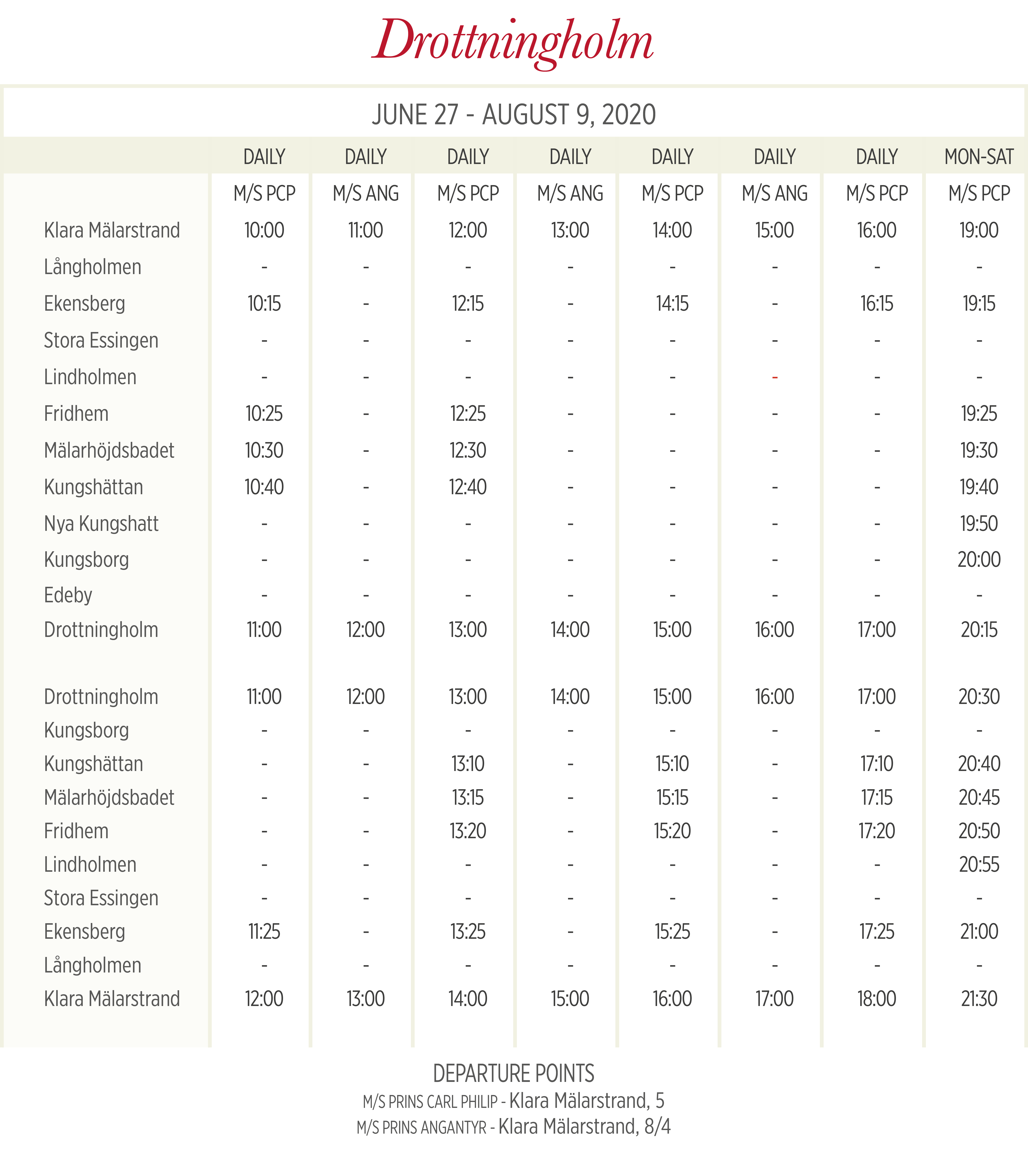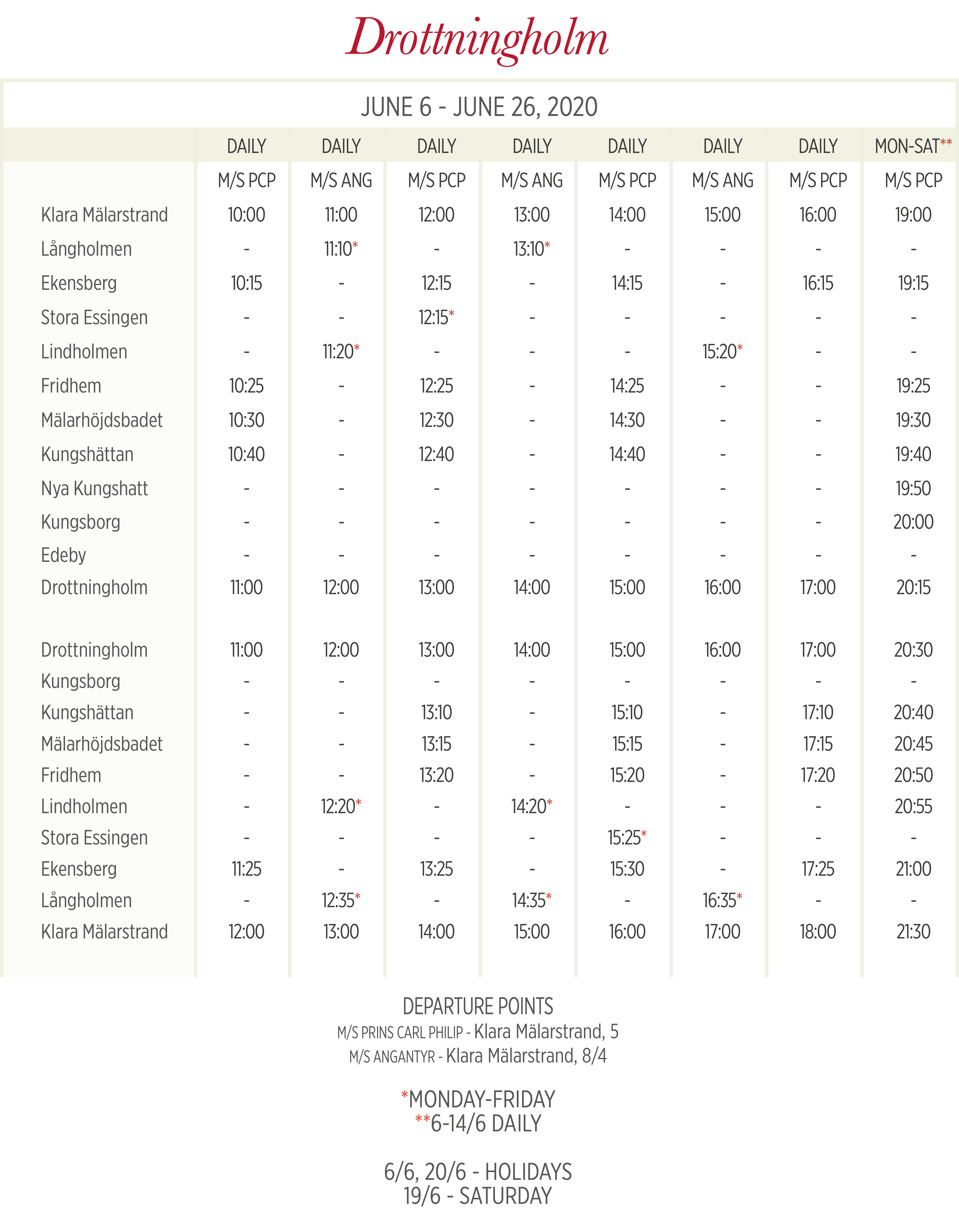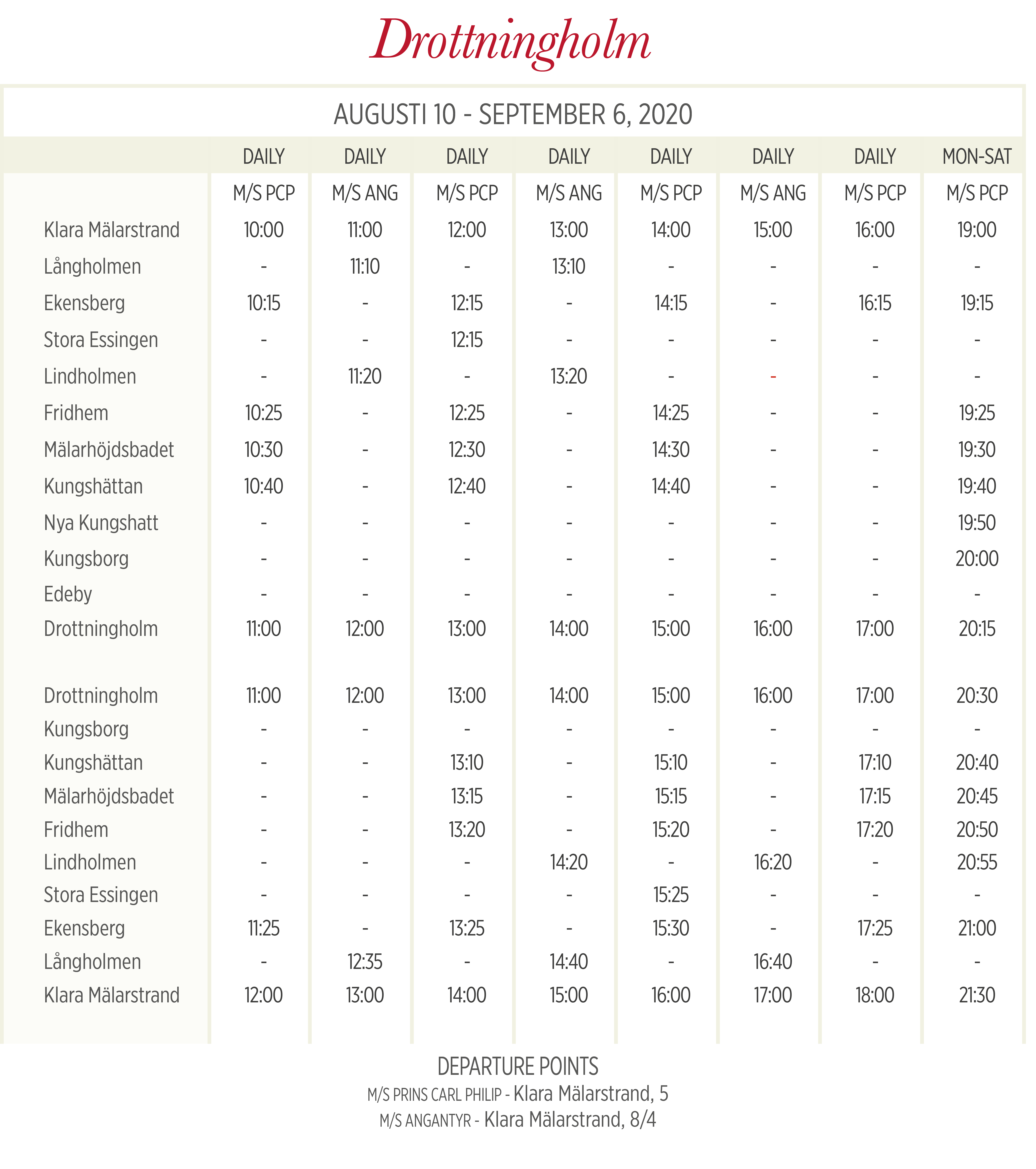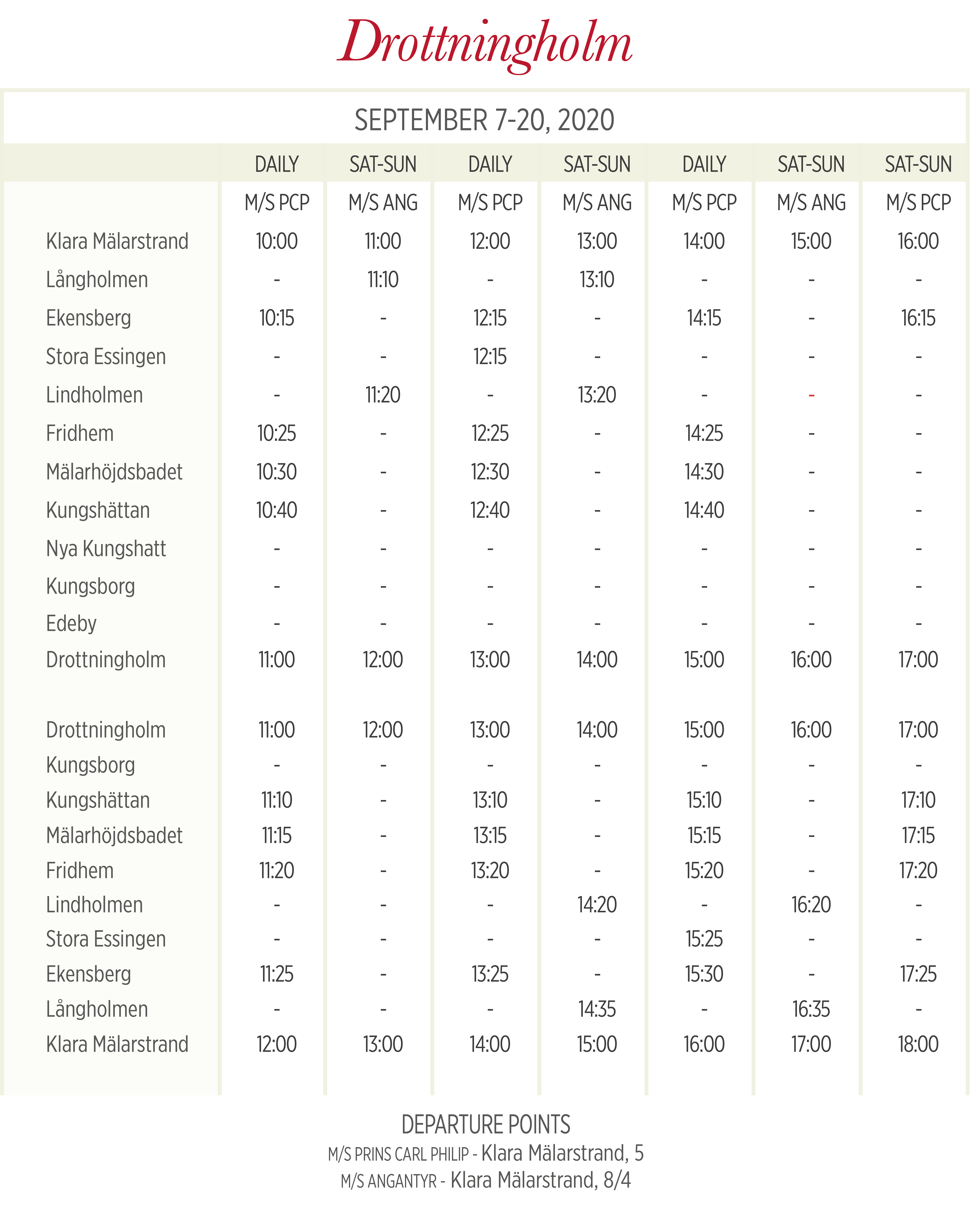 | Согласно текущему расписанию (срок действия 15.12.2019–18.06.2020), поездка в одном направлении по маршруту Ropsten – Gåshaga brygga (и наоборот) обычно занимает 22–23 минуты (для ряда первых утренних [только по выходным и праздничным дням] и последних вечерних рейсов – 21 минуту). | ||